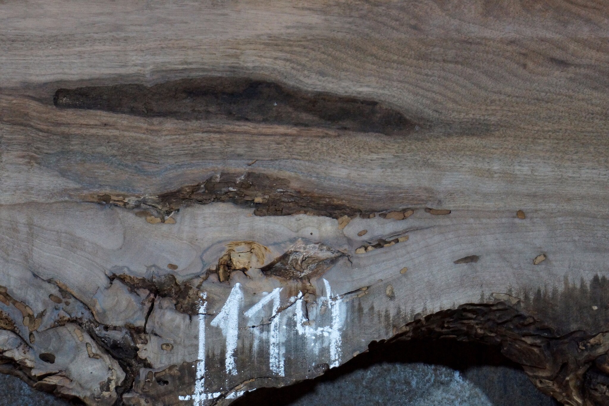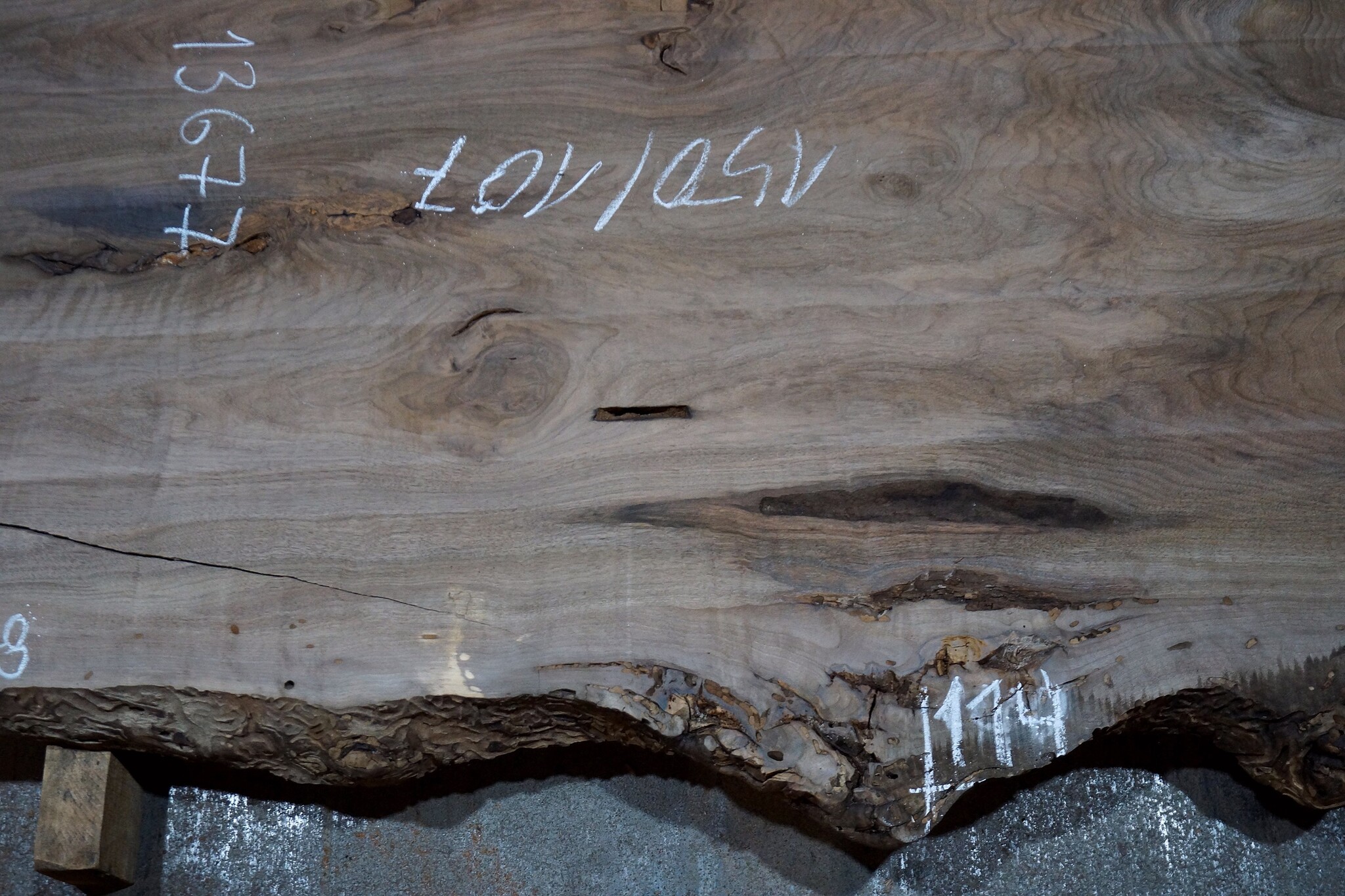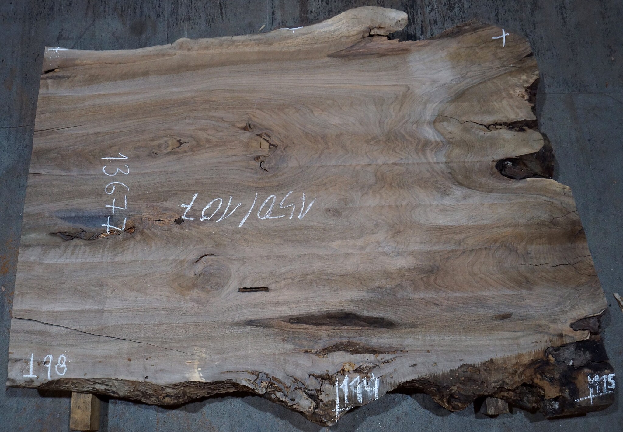 Caucasian Walnut, table top, milled, approx. 1500 x 1700 x 65 mm, 13677 G, flamed, air dried, insect holes, ingrown bark, knots, cracks. You will receive the product as shown.