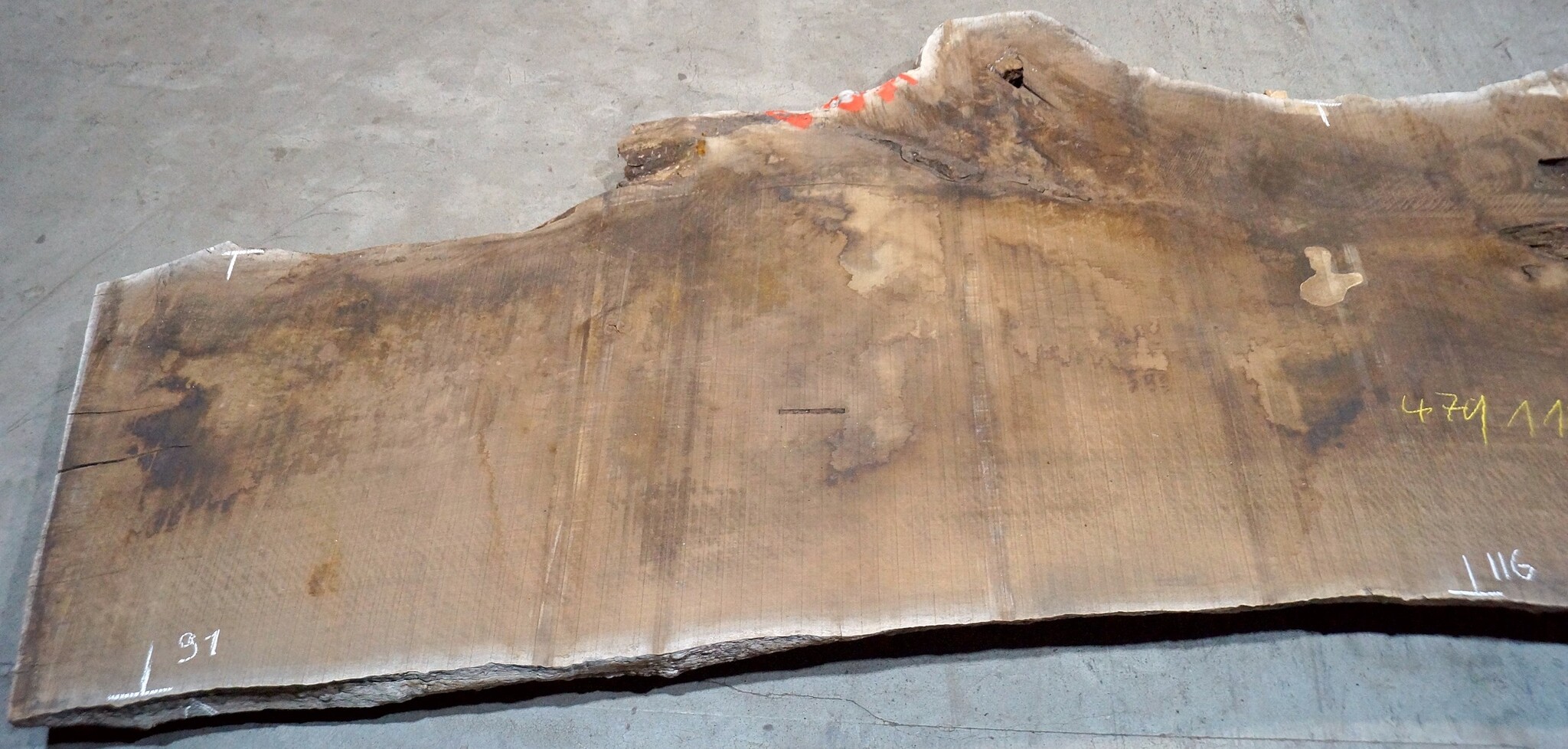 Caucasian Walnut, table top, approx. 4700 x 1150 x 80 mm, 13682, air dried, knots, cracks, rotten spots, insect holes, curved. You will receive the product as shown.