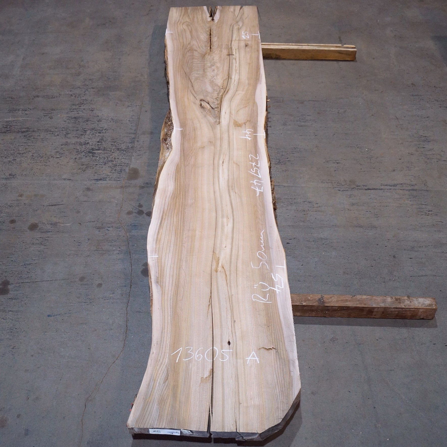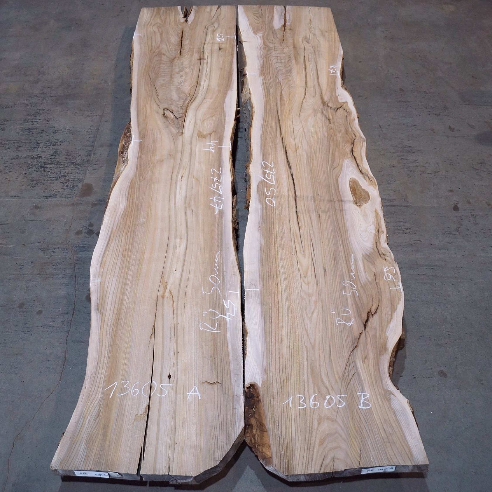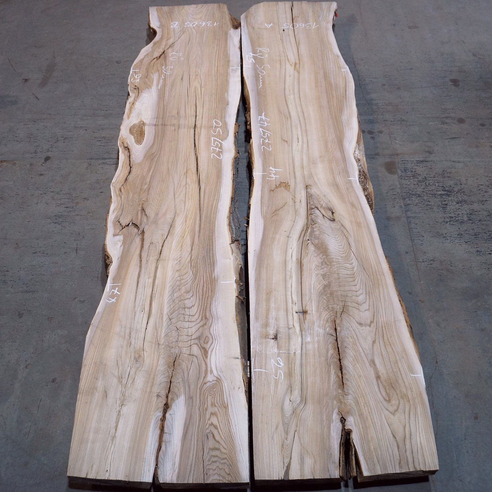 Dutch elm table top pair, approx. 2x 2750 x 470 x 50 mm, 13605a+b, milled, kiln dried, cracks, ingrown bark, knots. You will receive the exact product shown on the pictures.