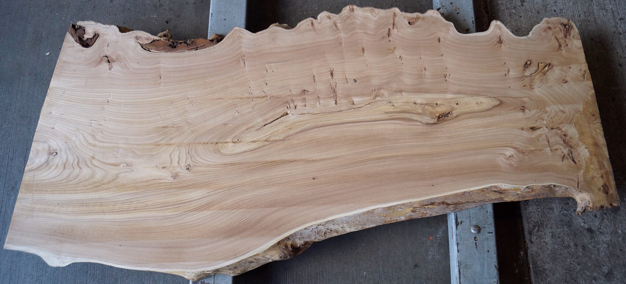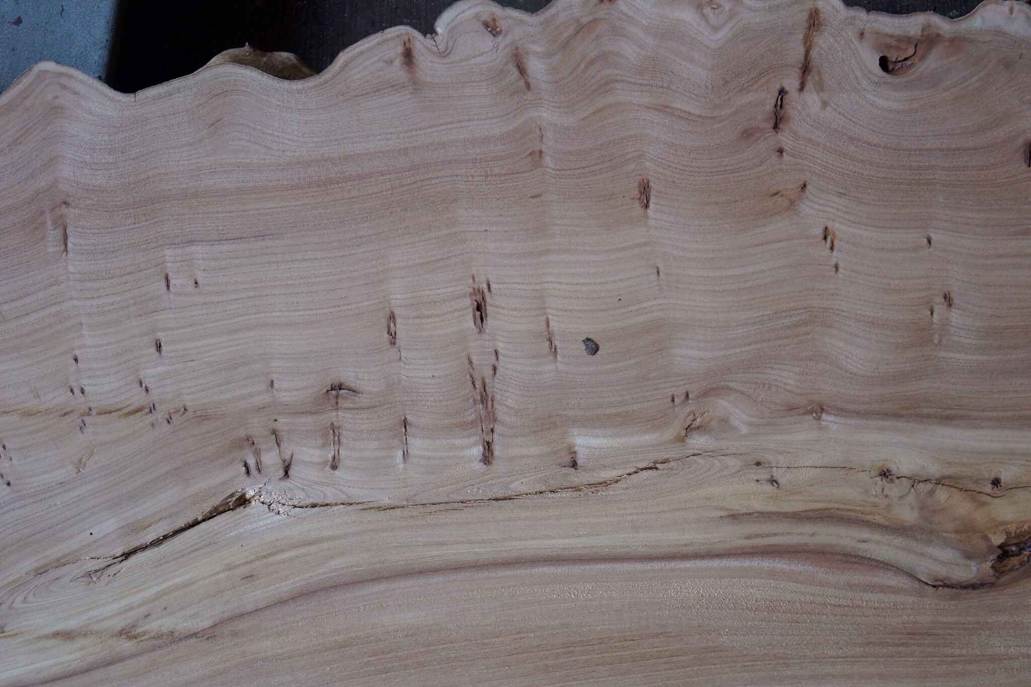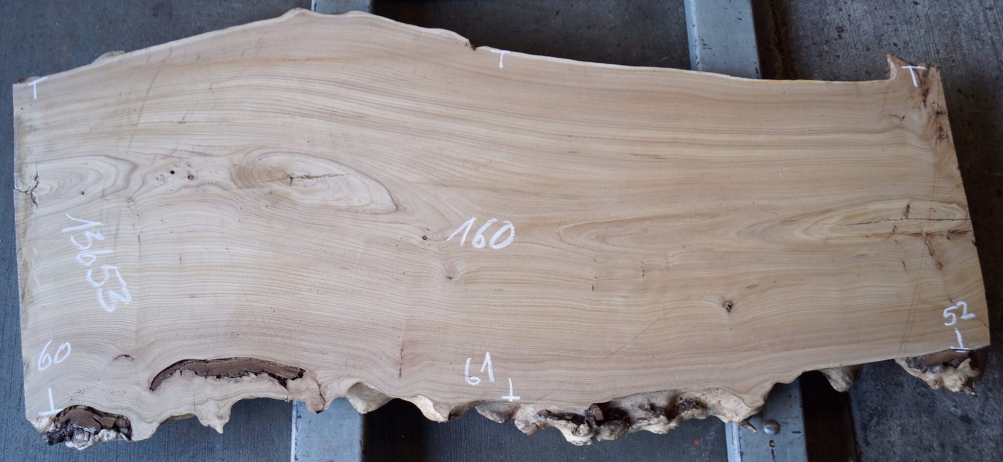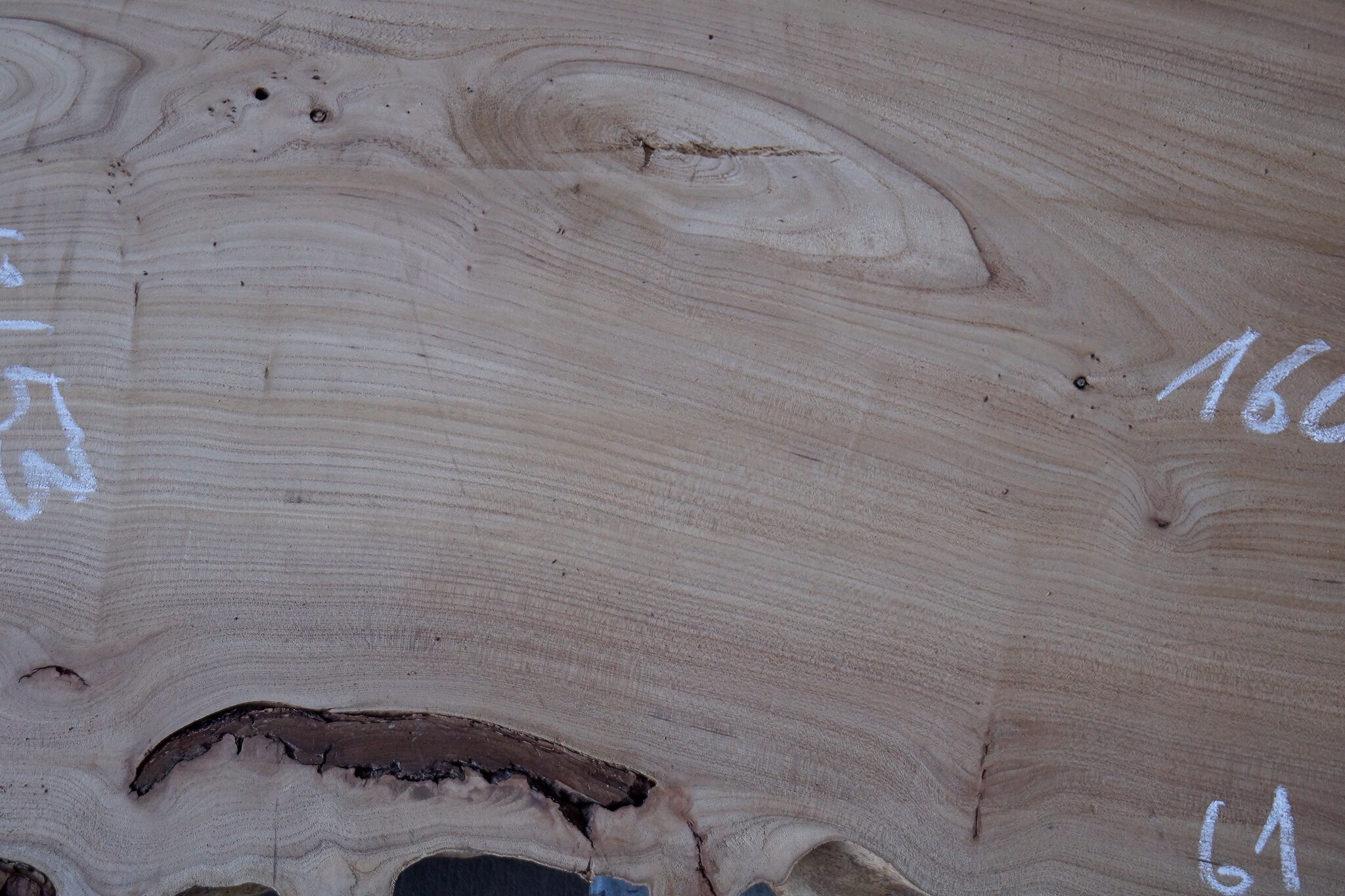 Elm table top, milled, approx. 1600 x 610 x 54 mm, 13653, kiln dried, cracks, ingrown bark, knots. You will receive the exact product shown on the pictures.
