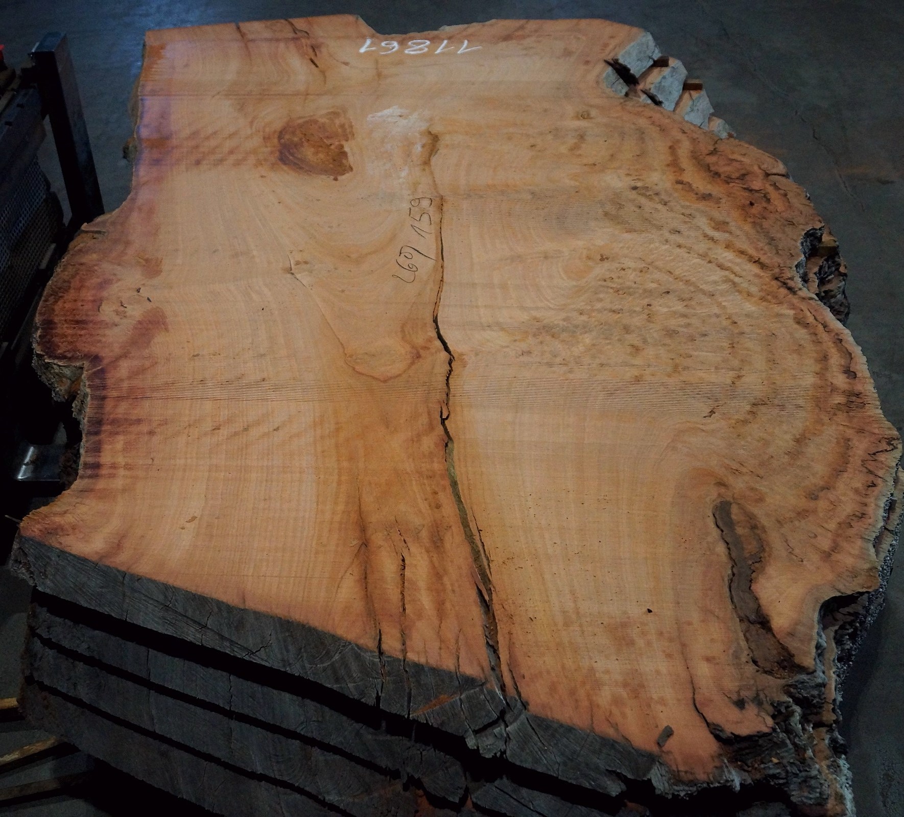 Eucalyptus burl, table top, approx. 2600 x 1590 x 52 mm, 11861, fresh - cut in 09/2020. Ingrown bark, cracks and rotten areas possible. You will receive the product as shown.