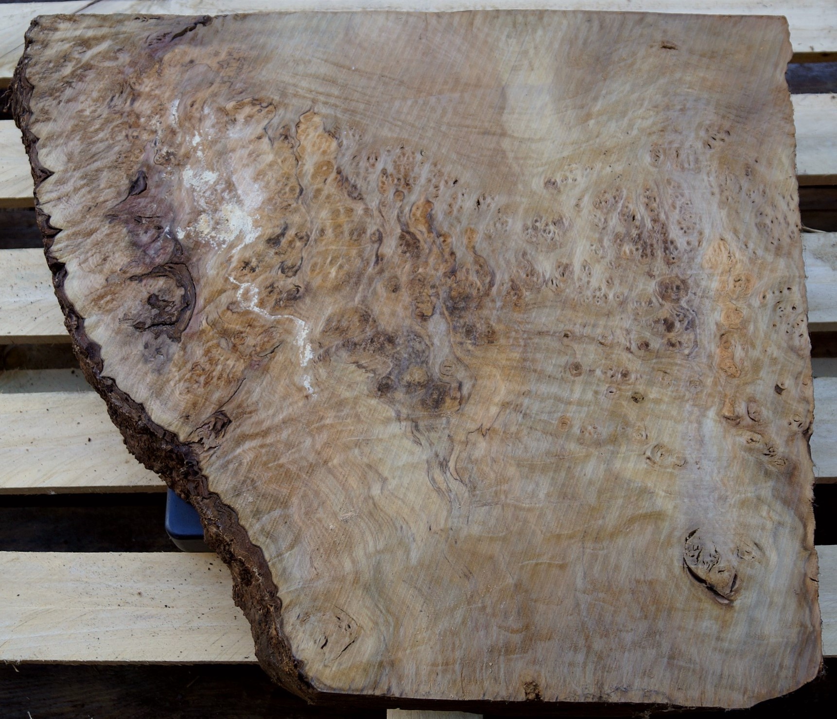Laurel, burl slab, approx. 580 x 570 x 65 mm, 40718, stored for a long time. The following defects are possible: Cracks, branch holes, ingrown bark. You will receive the product as shown.