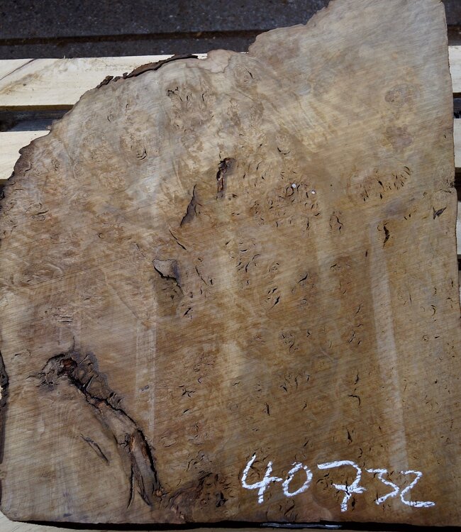 Laurel, burl slab, approx. 660 x 620 x 65 mm, 40732, stored for a long time. The following defects are possible: Cracks, branch holes, ingrown bark. You will receive the product as shown.