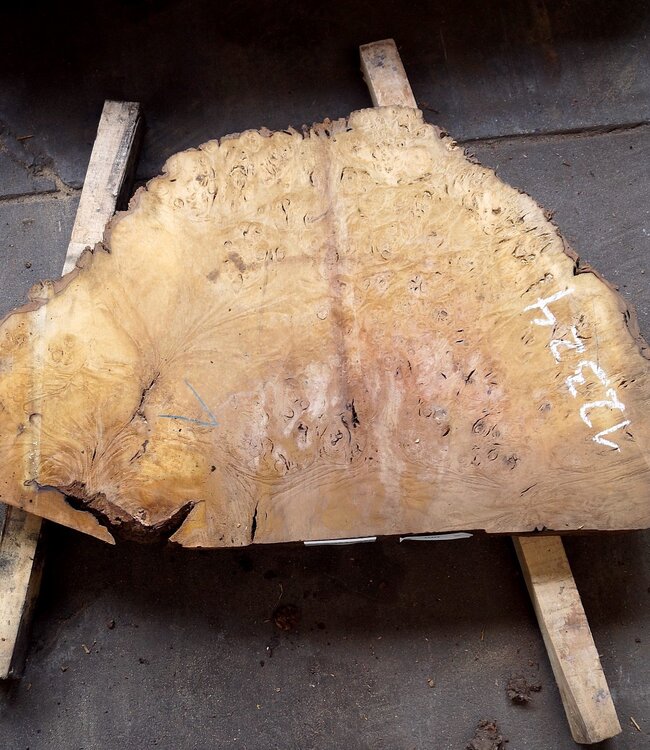 Laurel Burl, table top, approx. 1040 x 670 x 65 mm, 12324, air dried, cut in 2010, cracks. You will receive the product as shown.