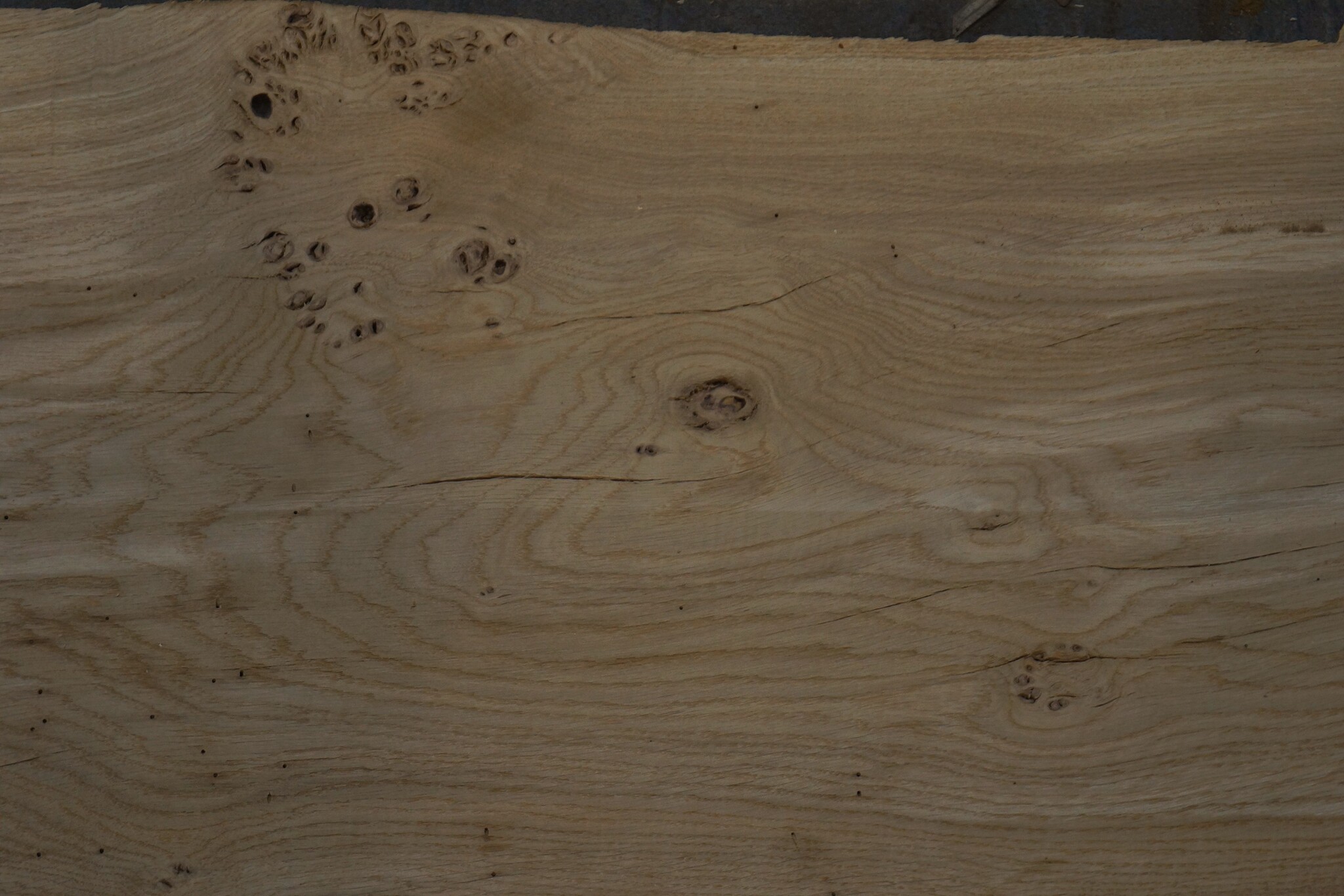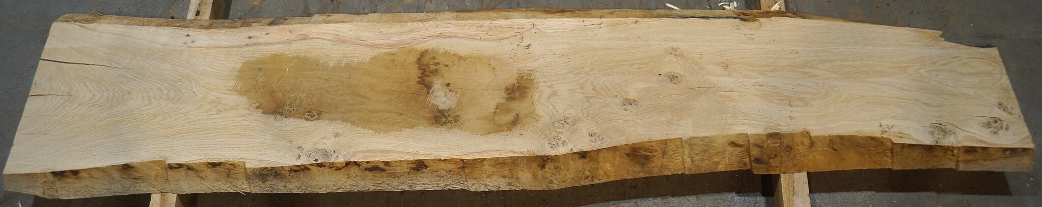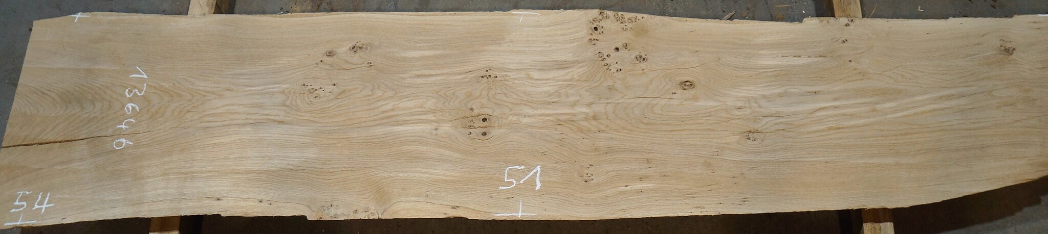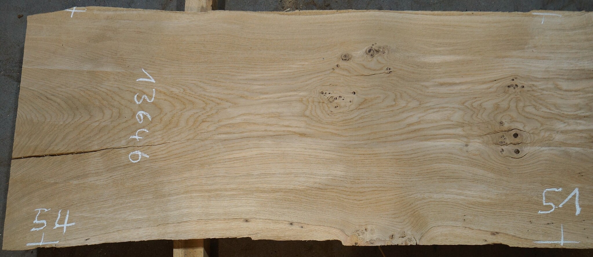 Oak, milled, approx. 2550 x 540/510/350 x 48 mm, 13646, kiln dried, broken into two pieces, knots, cracks. You will receive the product as shown.