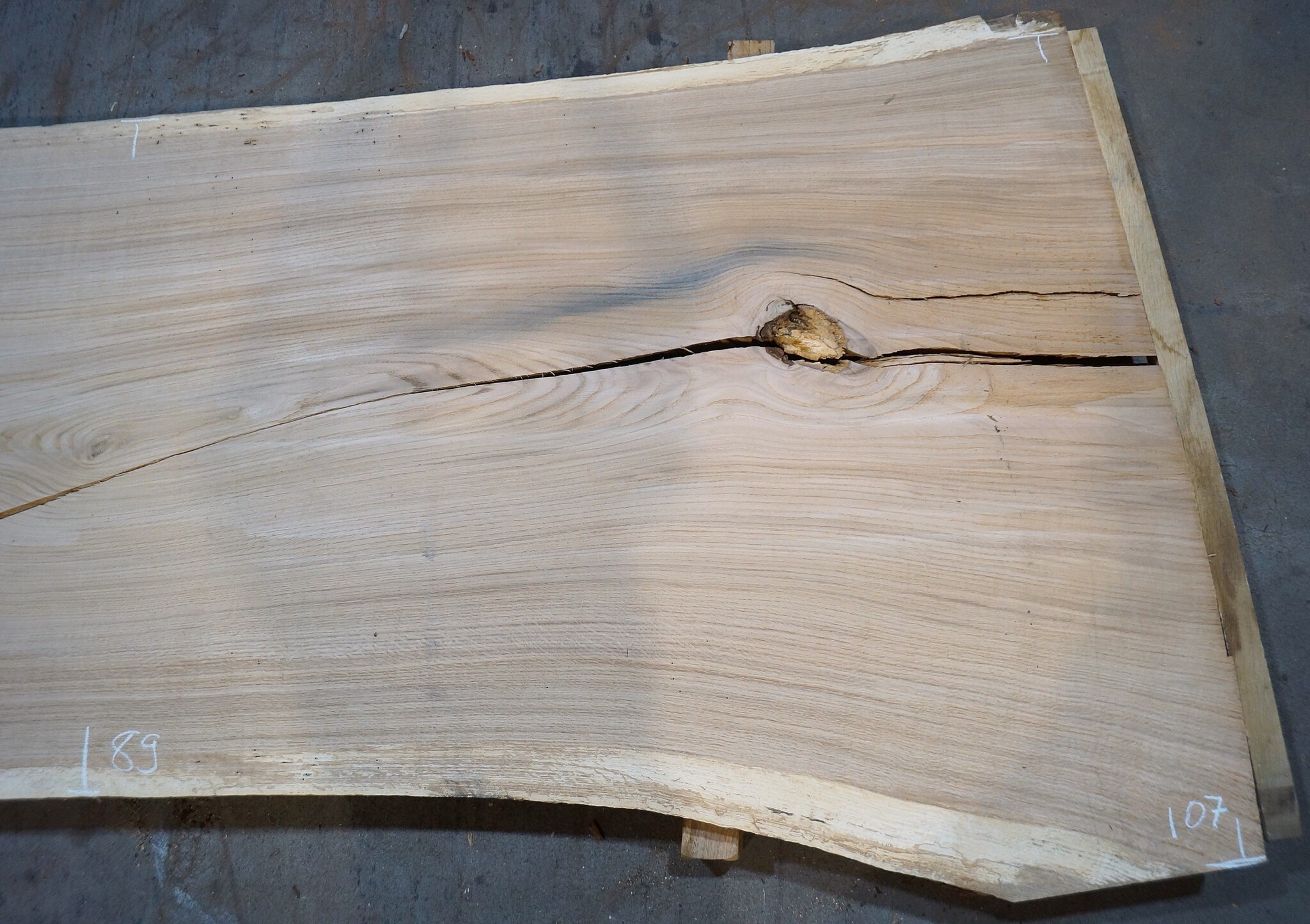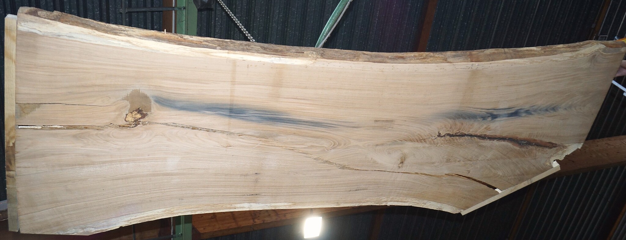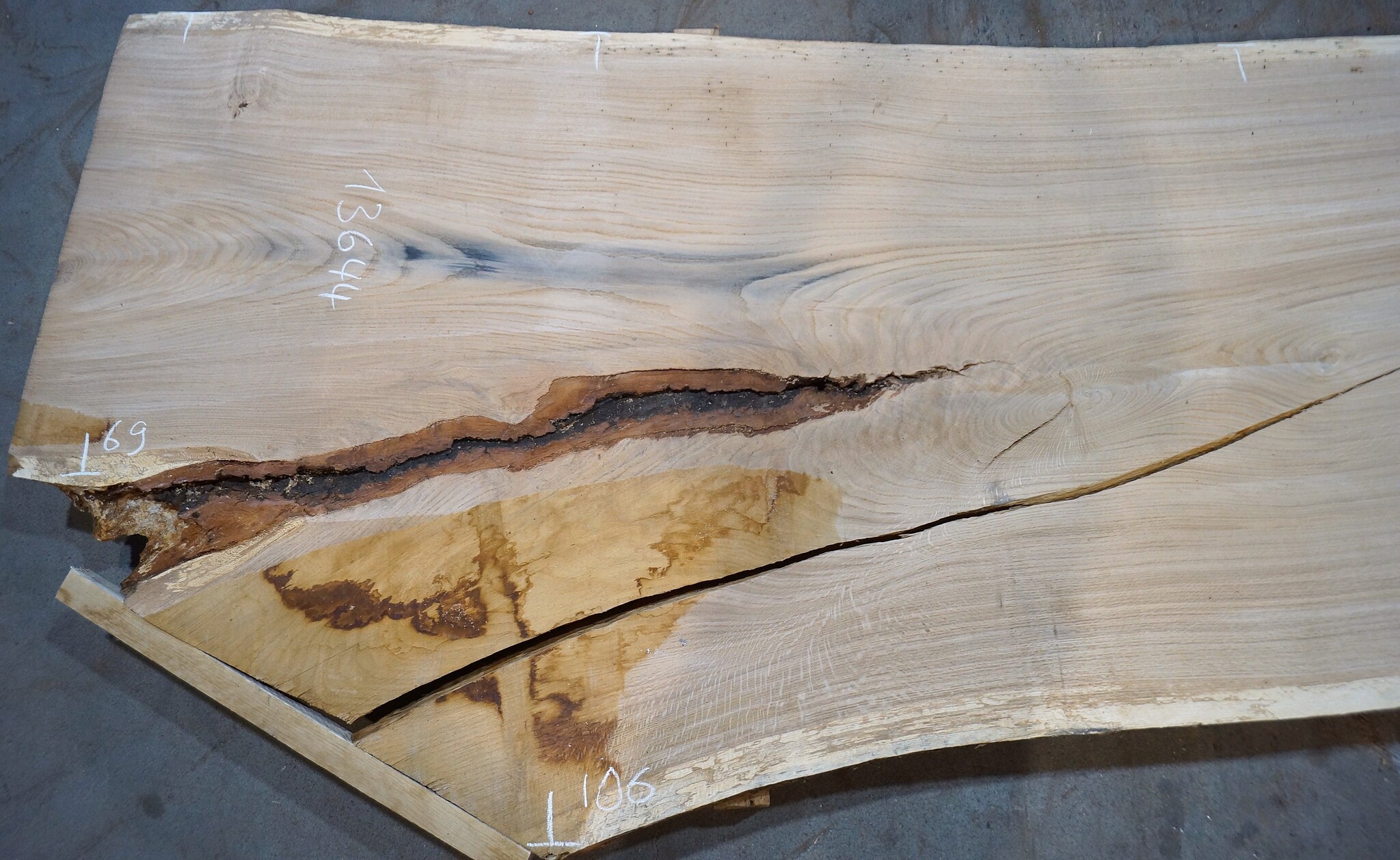 Oak, milled, approx. 2900 x 690/1060/890 x 52 mm, 13644, kiln dried, ingrown metal, knots, cracks, ingrown bark, insect holes. You will receive the product as shown.