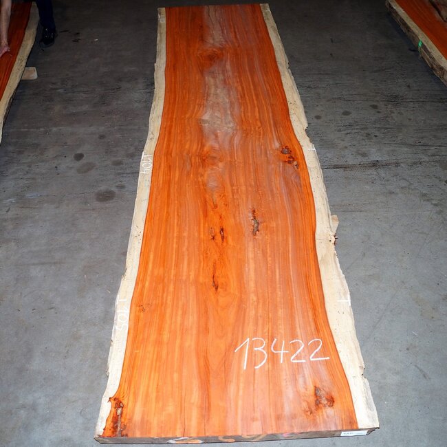 Padouk Table top, milled, approx. 4100 x 1040 x 60 mm, 13422, kiln dried, insectholes in the sap, cracks, ingrown bark. You will receive the product as shown.