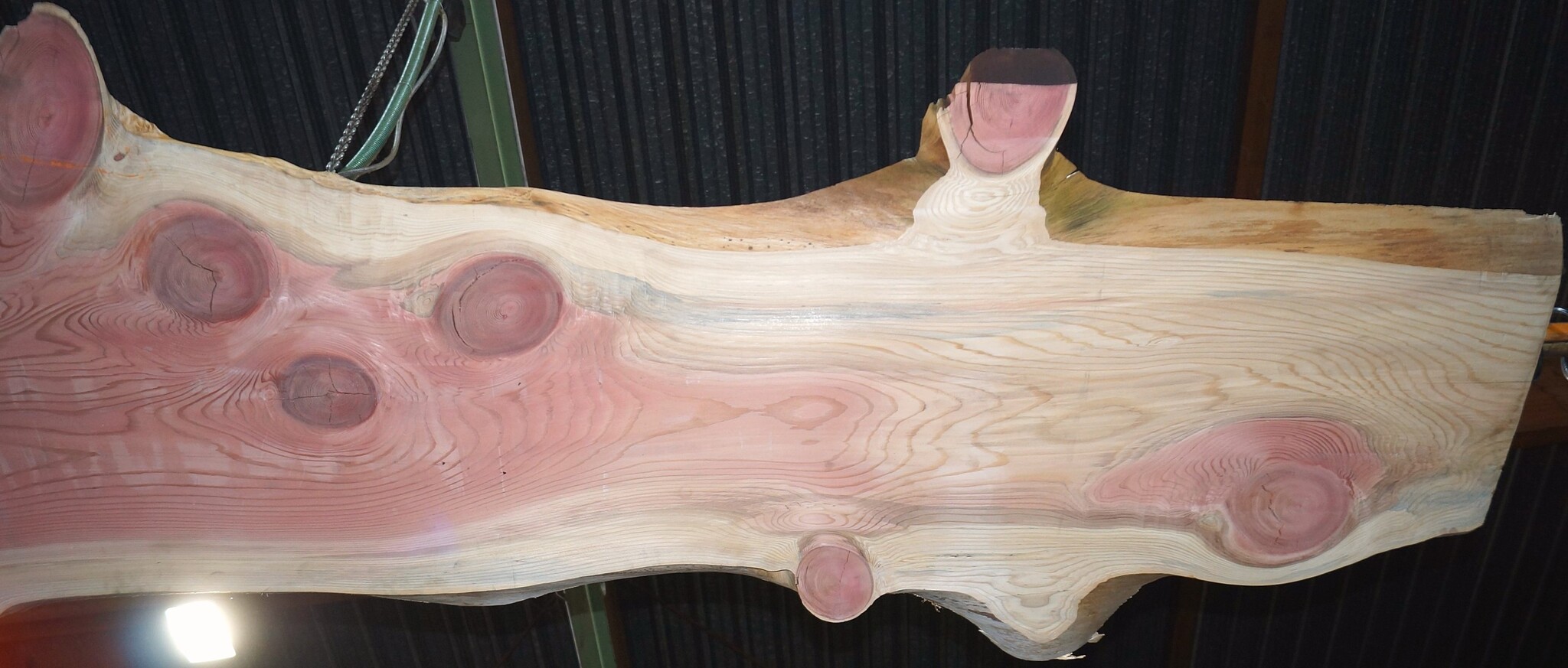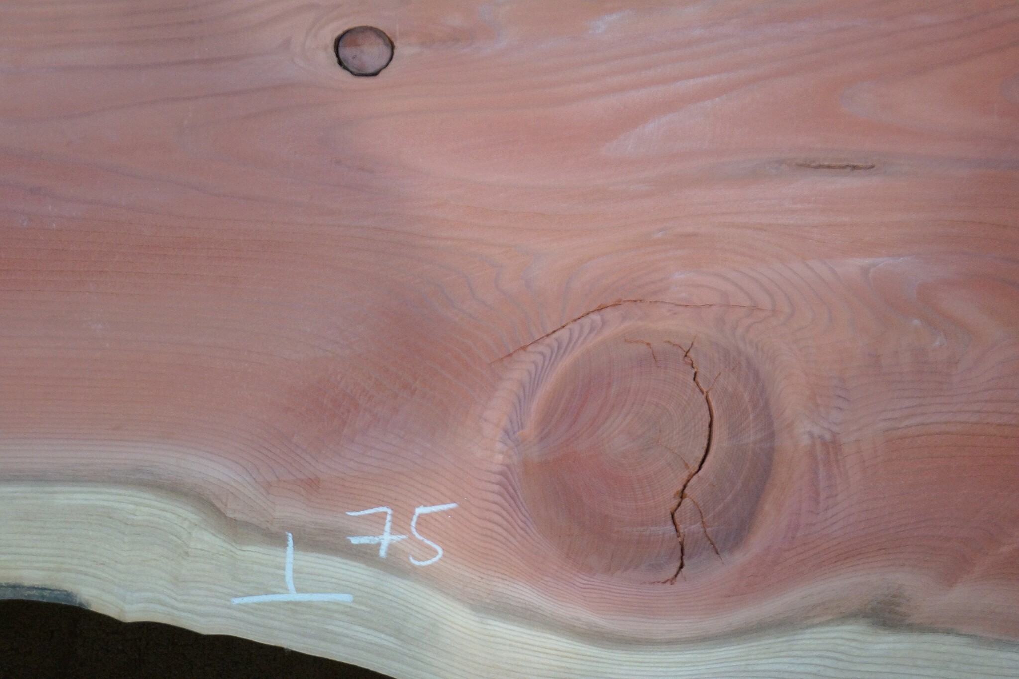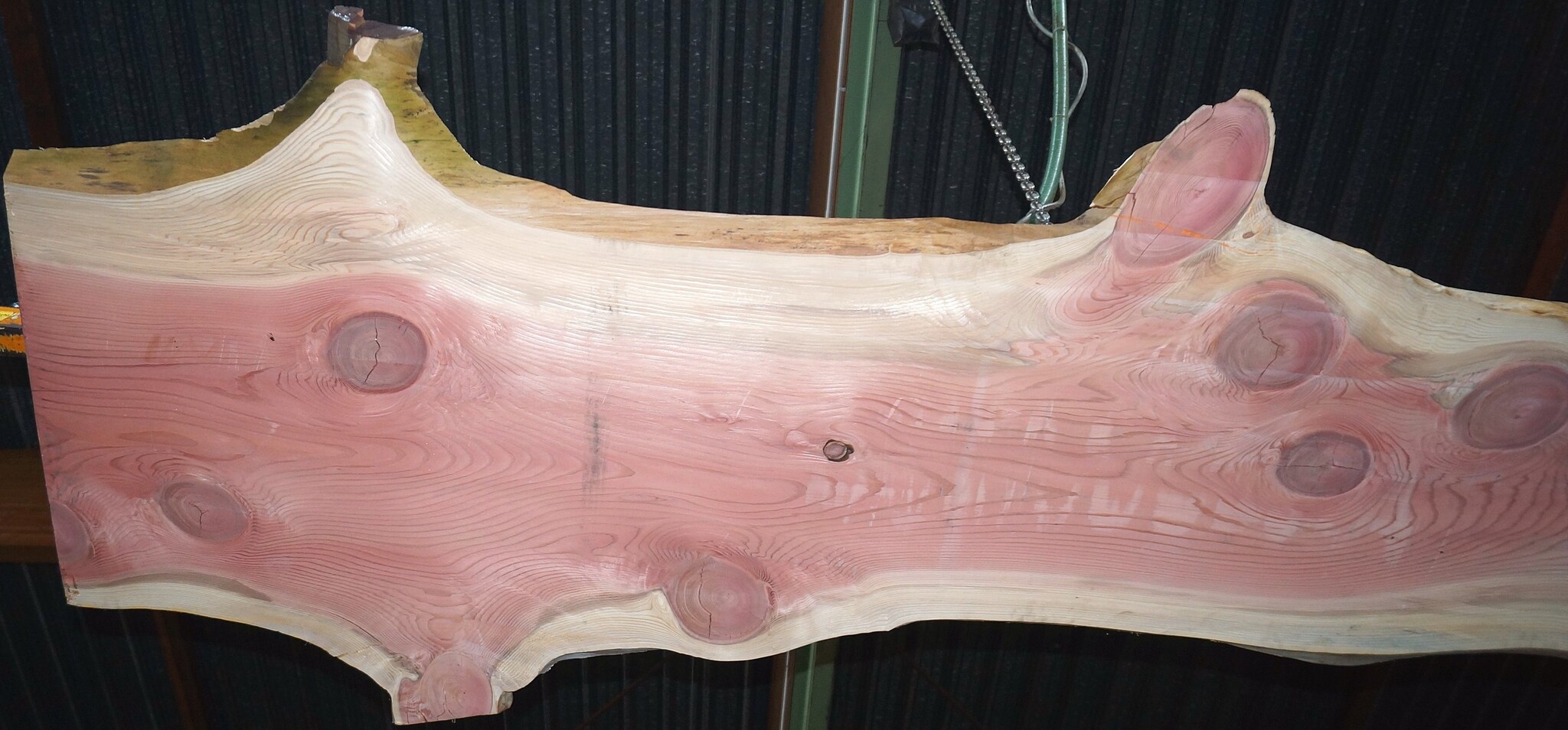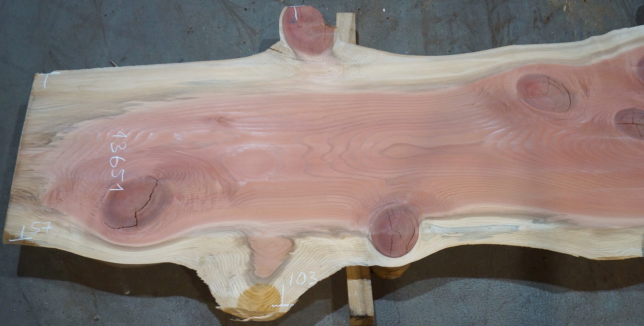 Redwood table top, milled, approx. 4000 x 570/1030/900 x 50 mm, 13651, kiln dried, knots, cracks, a lot of sap. You will receive the product as shown.
